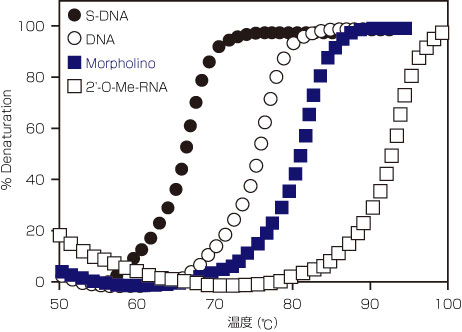 - モルフォリノオリゴとRNAのTm値は、天然DNAとRNAのTm値より少し高い値を示し、安定した結合を形成します。