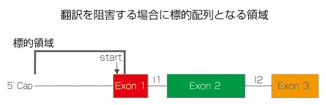 特定のmRNAの翻訳を阻害するためには、モルフォリノオリゴの一部が開始コドンの上流に結合していればよいので、5’-UTR(非翻訳領域)内の標的部位に相補的なモルフォリノオリゴを結合させます。翻訳開始複合体の一部であるリボソームの小サブユニットが5’キャップまたは内部リボソーム侵入部位(IRES)から開始コドンに向かって移動する際に、その経路上に結合したモルフォリノオリゴが小サブユニットの進行を停止し、成熟したリボソームの形成を中断することができます。なお、5’-UTR内にイントロンがある場合は、開始コドンがその後のエクソン内に現れることにご留意下さい。