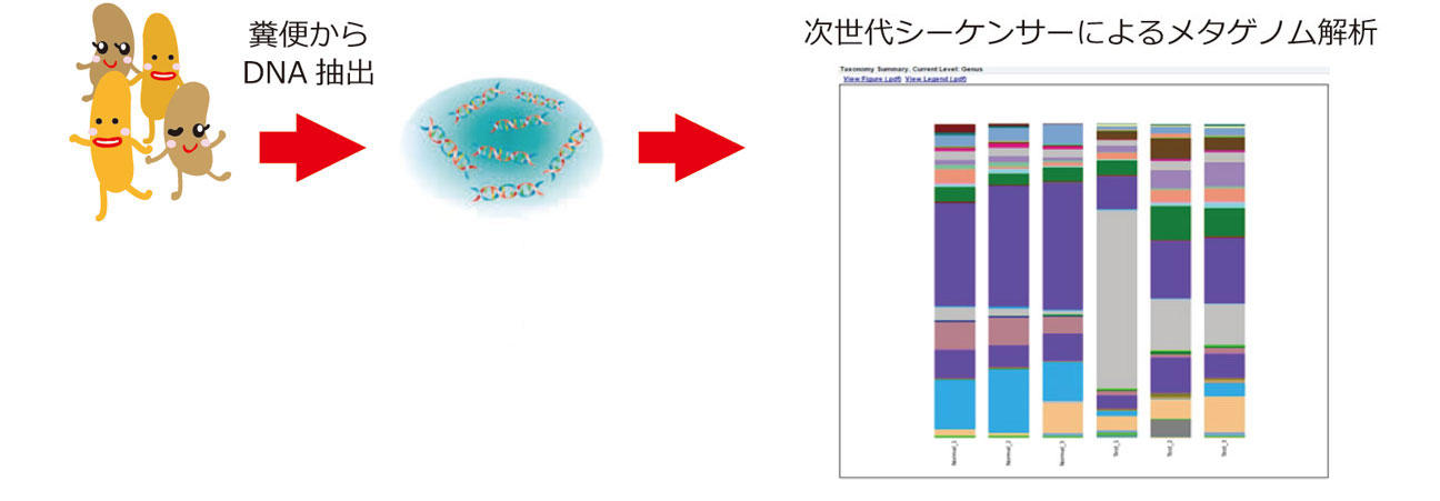 糞便からゲノムDNAを抽出し、16S rRNA領域配列を用いた次世代シーケンサーによるメタゲノム解析にて腸内フローラの解析を行います。メタゲノム解析では次世代シーケンサーを用いて1検体あたり100,000リードを目標として腸内フローラの網羅的な解析を行います。