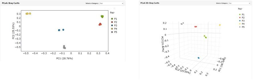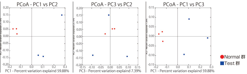 PCoAはサンプル間の類似度(非類似度)を視覚化するものです。プロット位置の距離は群集構造の類似度を表現し、距離が離れるほど菌叢が違うことを意味します。