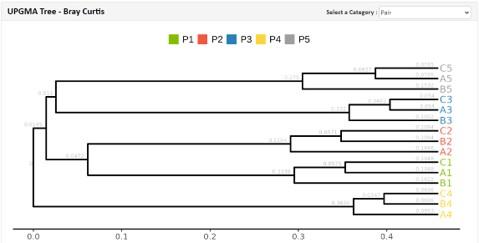 サンプル間の類似度(非類似度)を視覚化するために、階層的クラスタリング解析を行った結果です。群集構造が近いサンプル同士でクラスタリングされます。上流で分かれるほど菌叢が違うことを表します。また、枝の長さが菌叢の違いを表します。