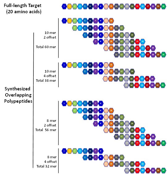 20個のアミノ酸からなるタンパク質の場合、合成ペプチド長とオフセット残基数により、重複残基数とペプチドアレイのサイズが決定されます。例えば合成ポリペプチドを10merにすると、2残基のオフセットを持つ6種のポリペプチドか4残基のオフセットを持つ4種のポリペプチドの合成が必要になります。