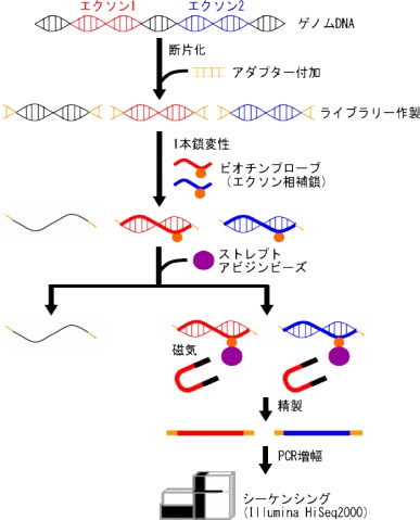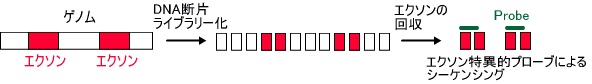 ゲノムワイドに遺伝的多型を探索する際、次世代シーケンシングの手法が優れています。しかしながら、膨大な情報量のゲノムからの読み取りには費用がかかるという問題点がありました。この問題を解決し、かつ冗長度を上げるために開発されたエクソーム解析では、ゲノムのエクソン領域に対するプローブを設計してエクソン特異的な読み取りを行います。本サービスにより、1塩基多型、挿入 / 欠損などエクソンに内包された各種多型の探索から統計解析までご提供が可能です。疾患と相関する変異や、マーカーを探索することができます。(