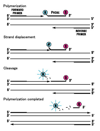 レポーターからの蛍光は、ターゲット遺伝子の量に比例するので、遺伝子発現は、蛍光量の増加として定量できます。