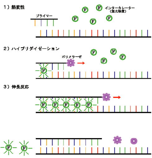 「SYBR GreenⅠ」は、二本鎖DNAに結合することで蛍光発光する試薬(インターカレーター)です。インターカレーターは、PCR反応によって合成された二本鎖DNAに結合し、励起光の照射により蛍光を発します。この蛍光強度を検出することにより、増幅産物の生成量をモニターできます。ターゲットに特異的な蛍光標識プローブを設計・合成する必要がなく、簡便にさまざまなターゲットの測定に利用できます。その反面、「SYBR GreenⅠ」は二本鎖DNAに入り込むと蛍光が増幅される性質をもった蛍光色素で、二本鎖DNAをその配列に無関係に検出します。つまり、プライマーダイマーができたり、非特異的なPCR産物ができる様な状況になると、この様な副産物も含めたシグナルを示してしまいます。