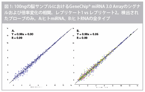 A.ヒト脳でmiRNA 3.0 Arrayを用いて検出されたmiRNAのRMAシグナル中央値の相関。
