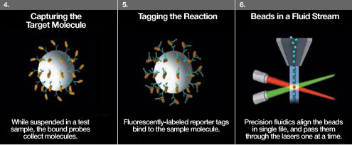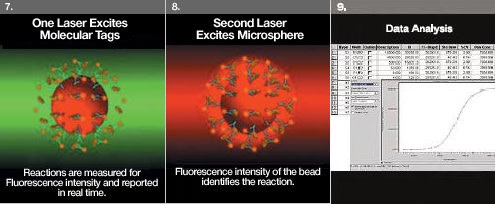 TM サスペンションアレイシステム」では、それぞれ異なるタンパク質に特異的に反応するものを結合した100種類のカラーコードビーズを使用します(