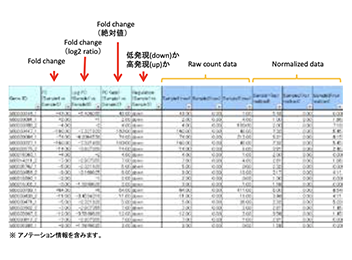 - シーケンス後のデータは、リファレンスゲノムにアライメント(マッピング)後、発現量を定量化(正規化)し、アノテーション情報を含むExcel形式のファイルを作成します。デフォルトでは、TMMで定量化します。ご要望に応じて、 発現変動遺伝子抽出、時系列解析、ターゲット遺伝子予測などの解析を実施します。正規化以降の解析をご依頼いただいた場合には、 6サンプル以上の場合で階層的クラスタリングと主成分分析(PCA)を行います。