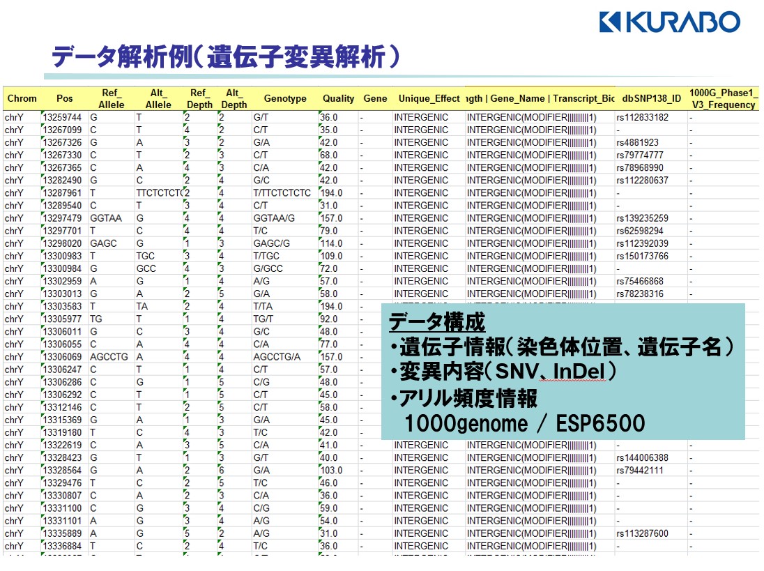 各染色体部位において検出した遺伝子変異情報(SNP, short InDel)をエクセルファイルにて報告します。変異情報としては①変異を検出した染色体部位(染色体番号、塩基番号)②変異情報(標準 / 変異塩基配列情報、シーケンス頻度)③変異箇所の遺伝子情報(遺伝子名、各種データベースID、変異頻度など)となります。(