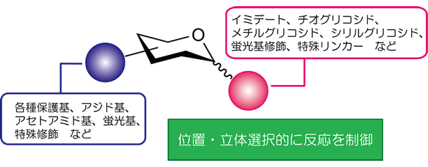 単糖の水酸基を適切に修飾するには、各単糖の立体、反応性を考慮してスキームを策定しなければならないため、熟練した技術と豊富な経験が必要になります。