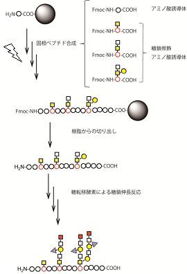固相法によりペプチドや糖ペプチドを合成した場合、長い反応時間を必要とする為、収率低下などの問題を生じますが、本合成法では、マイクロウェーブを照射することにより、反応時間や、収率低下などの問題を克服します。