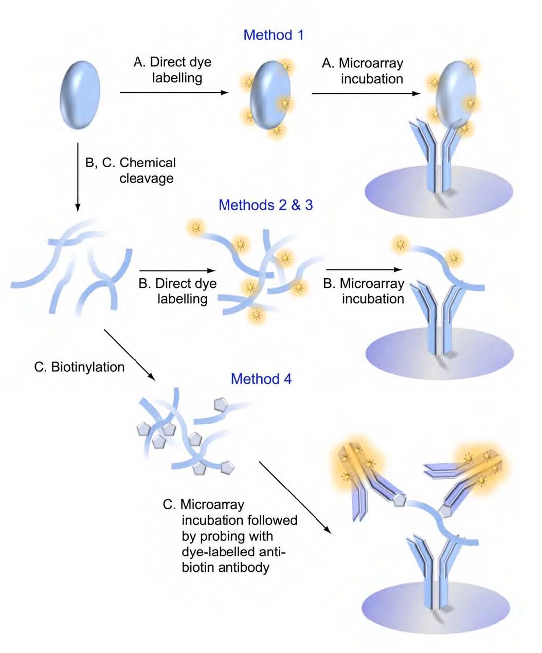 Method 4では、サンプルをホモジネートする際にCCC処理します。ビオチン化タンパク質をマイクロアレイ上でキャプチャーした後、アレイは蛍光標識されたビオチン抗体でプローブされます。この方法は、他の方法にくらべ、バックグラウンドシグナルが低く、また、広いダイナミックレンジをもたらしますので、