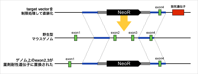 コンベンショナル・ノックアウトマウス (完全ノックアウトマウス 、単純ノックアウトマウスともいいます)の作製サービスを提供いたします。