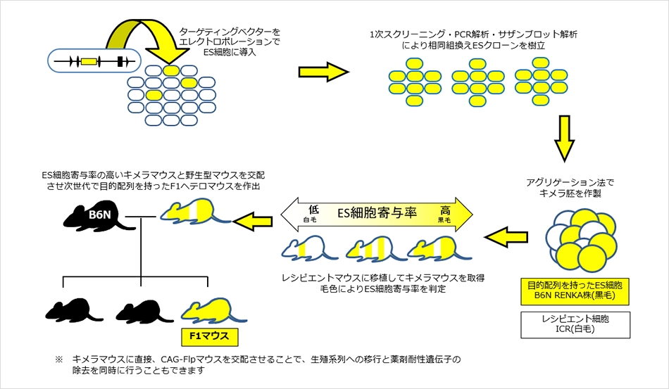| 薬剤耐性遺伝子の除去 | F1ヘテロマウスとCAG-Flpマウス(あるいは、CAG-Creマウス)との交配により、薬剤耐性遺伝子を除去。 さらに、野生型マウスと交配させ、Flpトランスジーン(あるいは、Creトランスジーン)を除去 |