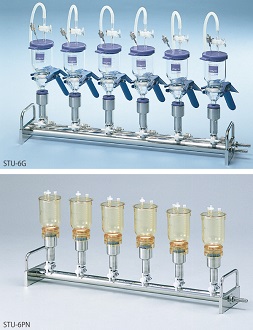 | 材質 | フィルターホルダー:硬質ガラス クランプ:アルミ合金 マニホールド:SUS304 三方コック:PTFE、FPM、真鍮 通気用フィルターホルダー:SUS304 ゴムキャップ:シリコーン | フィルターホルダー:ポリサルホン サポートスクリーン:ポリプロピレン ファンネルO-リング:シリコーン マニホールド:SUS304 三方コック:PTFE、FPM、真鍮 通気用フィルター:ポリプロピレン/PTFE |