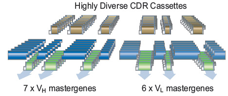 約450億ものパターンからなるHuCAL PLATINUM® は世界最大規模の高品質抗体ライブラリーです。このライブラリーは、大きな多様性を持つ相補性決定領域(CDRs)遺伝子とフレームワークマスター遺伝子の組を基礎とし、E.coliでの発現のために最適化されています。