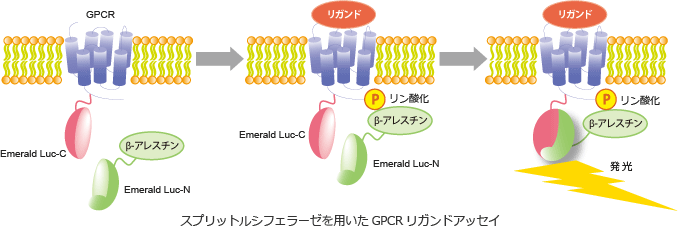fig.5)に示しますように、GPCRにEmerald-LucのC-末部分を、β-アレスチンに同N-末部分を結合させた遺伝子を細胞内で同時に発現させ、リガンドのGPCRへの結合をスプリットルシフェラーゼで検出するアッセイ系を構築しております