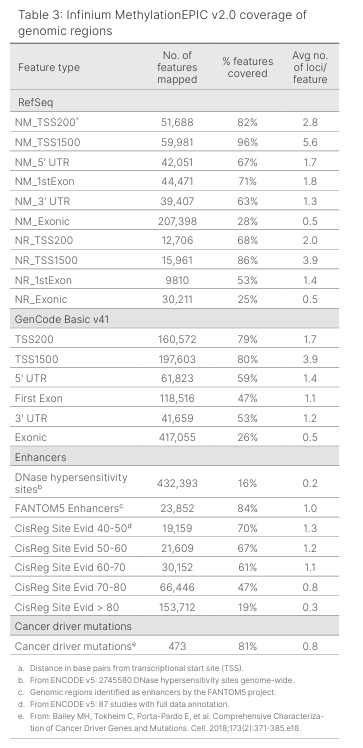 fig.4:表3)。新バーションの BeadChip では、DNA メチル化研究において、基礎となる一塩基多型(SNP)、クロスハイブリダイゼーション、およびマルチマッピングの挙動[8]により、日常的に除外される非機能性プローブを削除し、エピジェネティックス コミュニティによって特定されたより多くの機能的コンテンツを搭載しました。