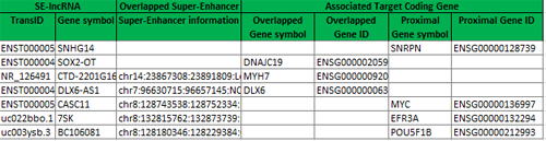 (スーパーエンハンサー、SE-LncRNAおよびそれらに関連する標的コード遺伝子についての詳細なアノテーション)(fig.2)(fig.3)