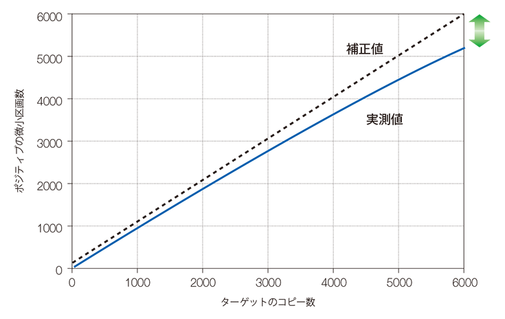 サンプル中のターゲット遺伝子コピー数が多くなるほど、複数個のターゲッ トを含む微小区画も増加するので、これをポアソン分布で補正してコピー 数を算出します。(