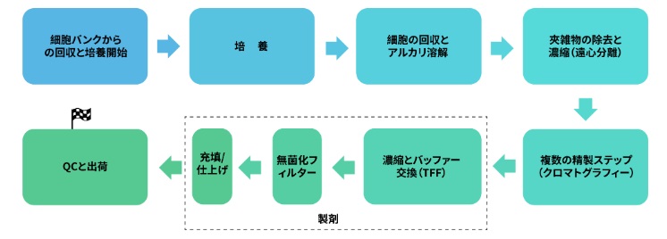 VectorBuilderは、品質の良い製品を納期通りにお届けすることに努めています。プラスミドDNAの典型的なGMP製造ワークフローを示します(