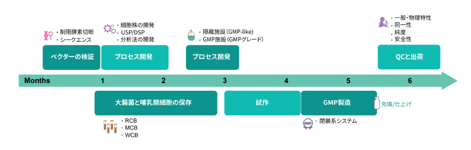 VectorBuilderは、様々な種類のウイルスの作成に関する広範な専門知識と経験を持っています。VectorBuilder社は、遺伝子治療薬開発パイプラインに沿った、あらゆる要求に応えるため、様々な規模と品質のウイルス製品を提供します。アデノ随伴ウイルス (AAV) とレンチウイルスの大規模GMP製造のためのプラットフォーム技術を確立し検証しています。またアデノウイルス、 MMLV、単純ヘルペスウイルス (HSV)、そして水泡性口炎ウイルス (VSV)など、他の種類のウイルスベクターの製造経験も豊富にあります。創薬研究、臨床研究、臨床試験、商品化など様々なダウンストリームのアプリケーションをカバーした、異なるグレードのウイルスをご提供します。