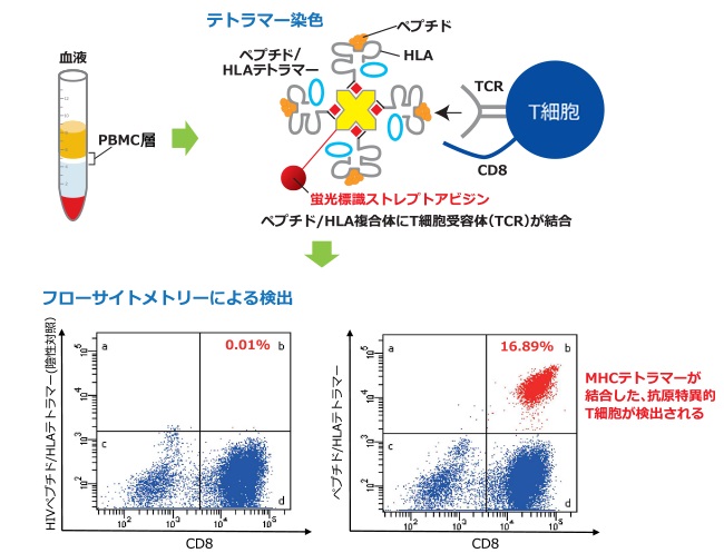 | フローサイトメトリーによる検出 | フローサイトメトリーにより、蛍光標識MHCテトラマーに結合した抗原特異的T細胞を直接検出します。 |