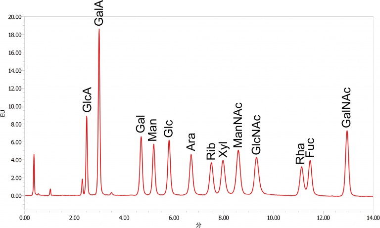標準品として、グルクロン酸 (GlcA)、ガラクツロン酸 (GalA)、ガラクトース (Gal)、マンノース (Man)、グルコース (Glc)、アラビノース (Ara)、リボース (Rib)、キシロース (Xyl)、N-アセチルマンノサミン (ManNAc)、N-アセチルグルコサミン (GlcNAc)、ラムノース (Rha)、フコース (Fuc)、N-アセチルガラクトサミン (GalNAc) を使用いたします。
