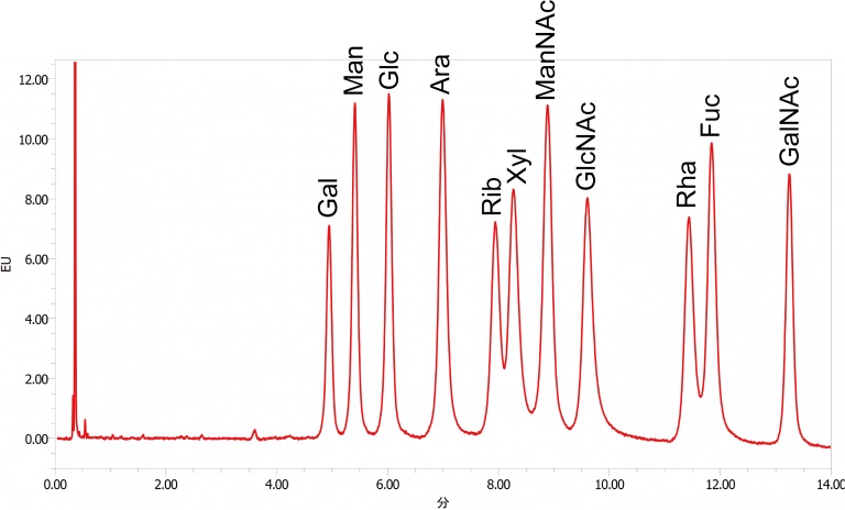 標準品として、ガラクトース (Gal)、マンノース (Man)、グルコース (Glc)、アラビノース (Ara)、リボース (Rib)、キシロース (Xyl)、N-アセチルマンノサミン (ManNAc)、N-アセチルグルコサミン (GlcNAc)、ラムノース (Rha)、フコース (Fuc)、N-アセチルガラクトサミン (GalNAc) を使用いたします。(