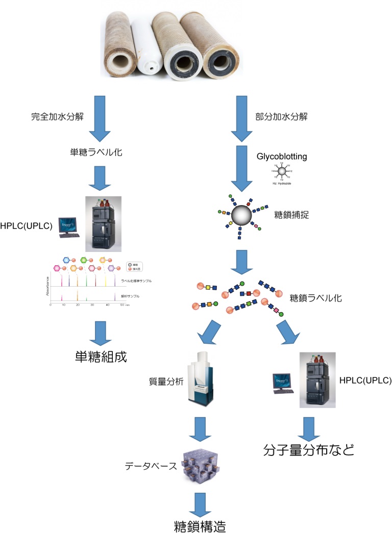 ファウリングを防ぐためには、その詰まりの原因物質を同定し、その特性にあわせた対策をする必要があります。医化学創薬株式会社では、北海道大学大学院工学研究院環境創生工学専攻の木村克輝先生の膜ファウリングに関する研究1,2 において、医化学創薬株式会社のノウハウを含む糖鎖解析技術をご提供し、膜の詰まりの原因と推定される微生物に由来する糖鎖を見出すことに成功しています。