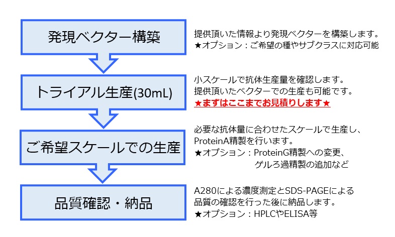 - 精製抗体の納品:培養上清からProtein A精製し、SDS-PAGE評価実施後、納品