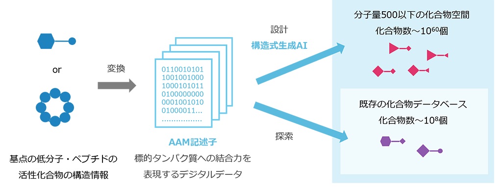新規化合物は既存の化合物データベースから抽出する【探索】と、構造式設計AIによる【生成】いずれかの方法があります。