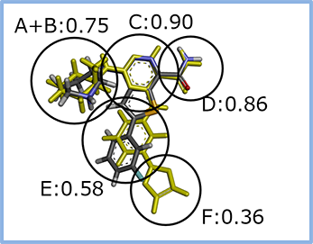 お客様からいただいた基点化合物をもとに、探索もしくは生成した新規化合物の構造情報と、それぞれのAAM類似度を併記して納品いたします。 構造式だけではなく、部分ごとのAAM類似度・基点化合物と三次元構造を重ね合わせた図も確認することで、どのような骨格変換がなされたかが分かり、お客様側で得られたアッセイ結果と併せて、SARの取得に活用することが可能です。 |