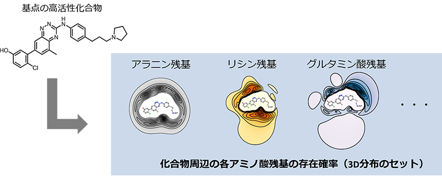 AAM記述子とは、化合物周辺における各アミノ酸残基20種の存在確率(3D分布のセット)のことを表し、化合物のみから分子シミュレーションによって第一原理的に計算されます。化合物間の骨格が異なるにも関わらず、AAM記述子の類似度(=AAM類似度)が高い場合がありますが、この場合、AAM類似度の高い化合物は同じようにアミノ酸残基と相互作用し、その結果として、同じようにタンパク質と相互作用することが分かっています。活性化合物のAAM記述子は、化合物側から抽出した標的タンパク質の結合サイトを近似して表現しています。