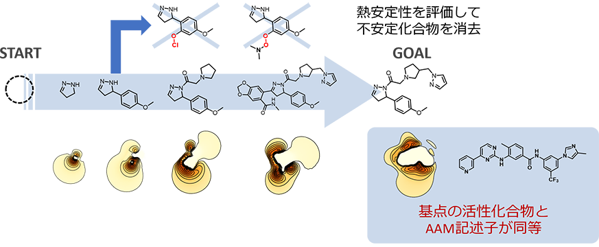 富士フイルムは、一つの活性化合物を基点に別骨格の活性化合物を増やすことを目的に、AIとシミュレーションに基づく新しい骨格変換の手法であるAI-AAM