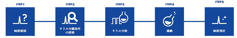 | STEP4 テスト分取品の確認 | テスト分取品の鏡像体過剰率、取得量、ラセミ化や分解の有無を確認し、本分取に要する日数を見積もります。 |