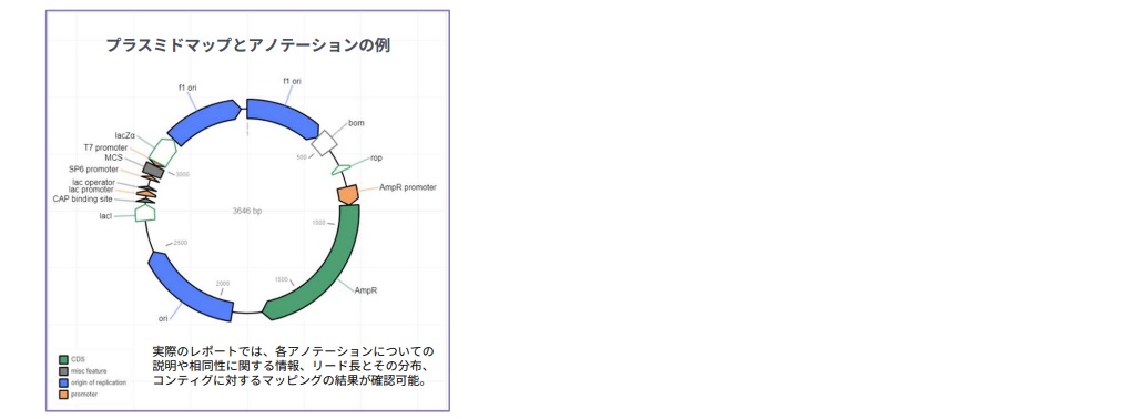 - 生データ(fastq)だけでなく、プラスミドマップやアノテーション情報等(fig.1)を含むHTML形式のインタラクティブなレポートを納品