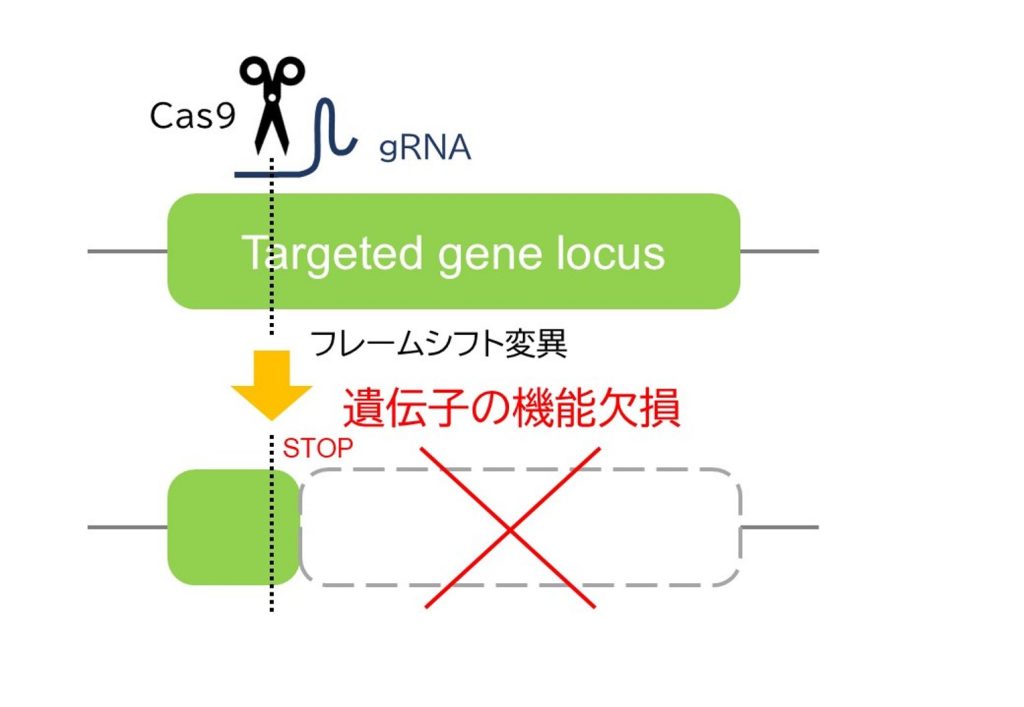 ガイドRNA、Cas9タンパク質を用いて、標的遺伝子に数塩基のランダムな塩基の欠損や挿入(indels)を導入した遺伝子改変マウスを作製します。フレームシフト変異による遺伝子の機能欠損(ノックアウト)が期待できます。