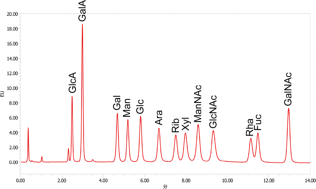 標準品として、ガラクトース (Gal)、マンノース (Man)、グルコース (Glc)、アラビノース (Ara)、リボース (Rib)、キシロース (Xyl)、N-アセチルマンノサミン (ManNAc)、N-アセチルグルコサミン (GlcNAc)、ラムノース (Rha)、フコース (Fuc)、N-アセチルガラクトサミン (GalNAc) を使用いたします。