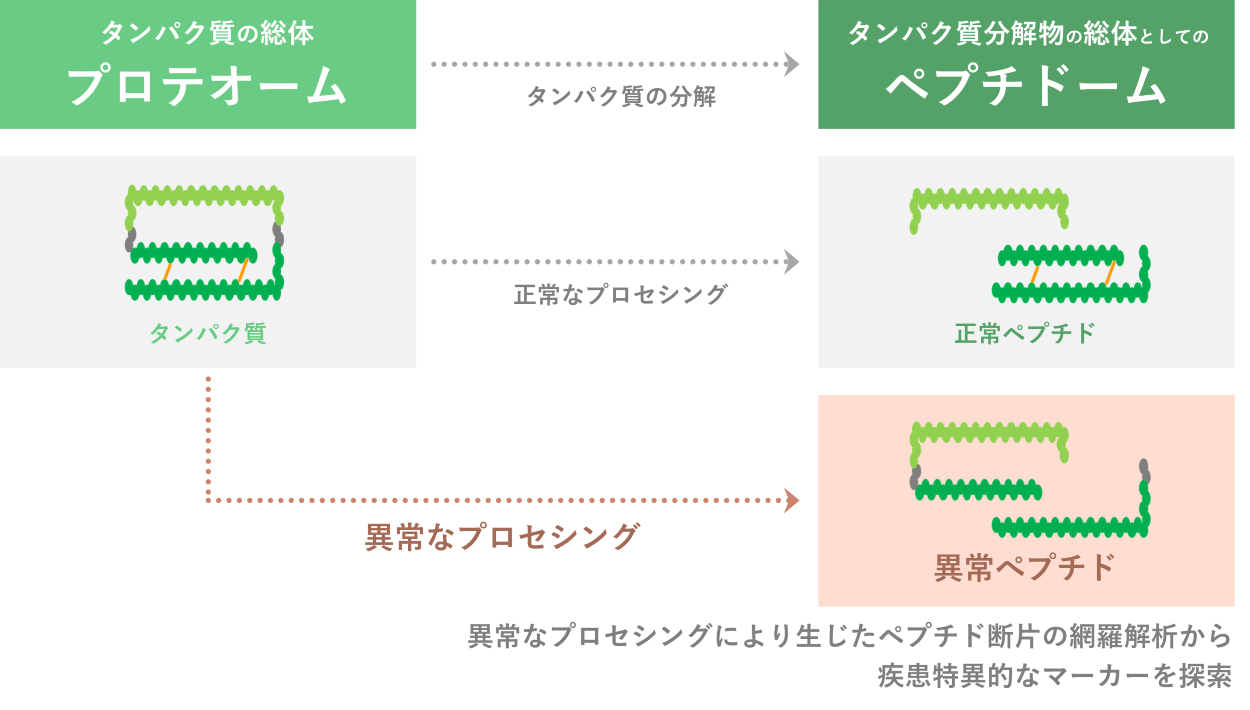 ペプチドスキャンアドバンストでは、タンパク質分解物の総体(ペプチドーム)を一斉分析可能です。異常なプロセシングにより生じたペプチド断片の網羅解析から疾患特異的なマーカーを探索する用途にご利用いただけます。(fig.1)