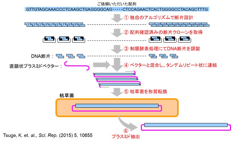 ®法を開発し、他の合成技術では対応できないような合成が難しい配列をお客様に安定した納期でお届けしています。例えば100kbを超えるような長鎖配列、多数の繰り返し配列を含むような一般的な技術では合成困難と言われている配列でも極めて高い成功率を誇っています。(