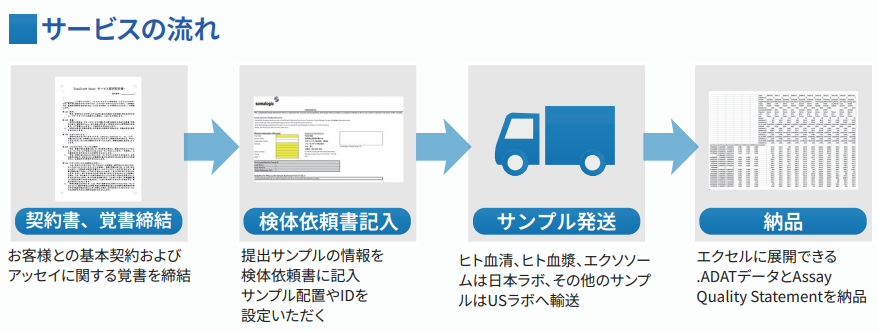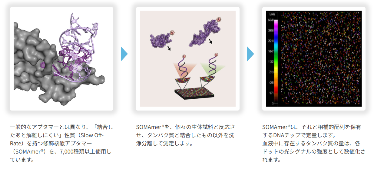 凍結サンプルを発送していただくだけで、最大約11,000種類のタンパク質を測定し結果をお届けします。アプタマーを用いたタンパク質測定サービスです。