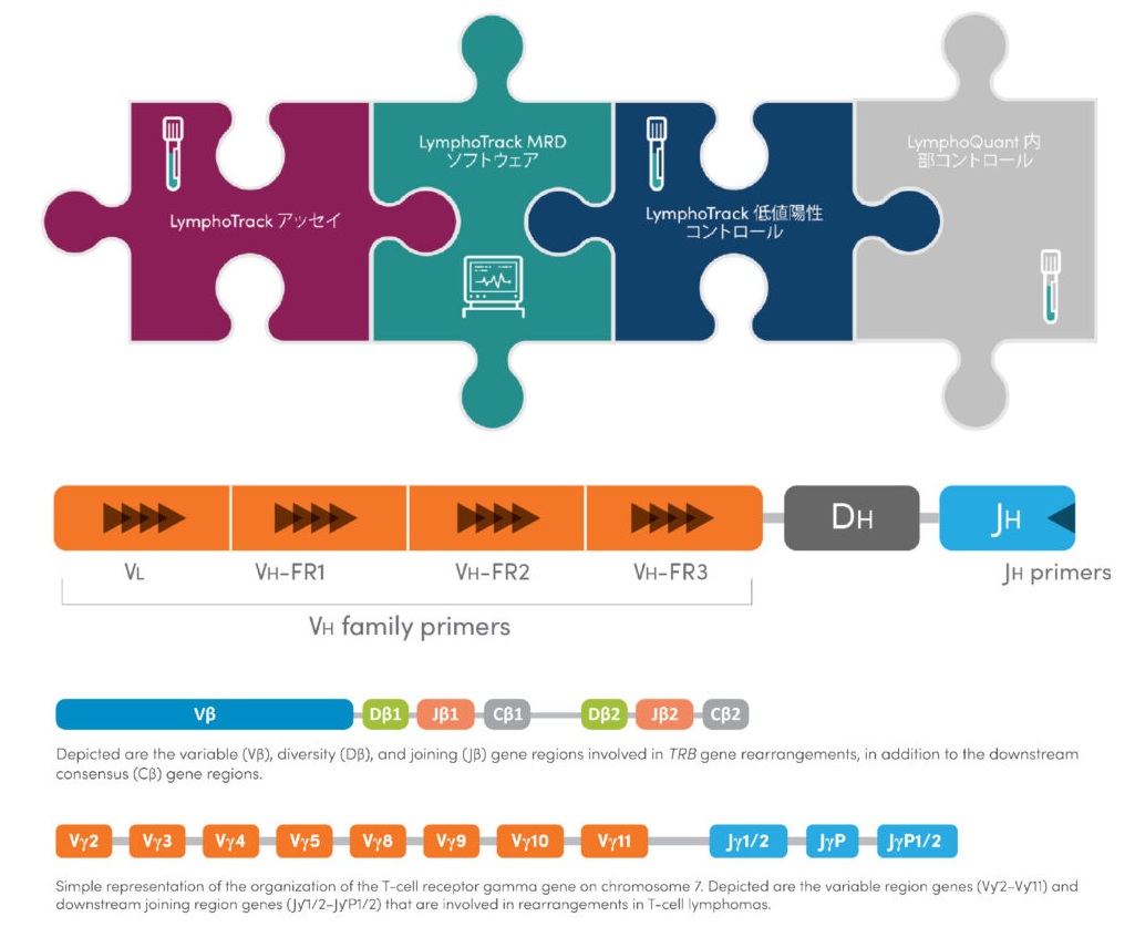 GxD社ではinvivoscribe社のLympho Trackシリーズ製品を用いた解析を提供いたします。Lympho TrackシリーズはTargetとなる遺伝子全体を解析することでT細胞とB細胞の評価を可能としております。また低濃度コントロールや内部コントロールを利用することも可能で、精度管理をしながら解析・評価することを可能にしています。