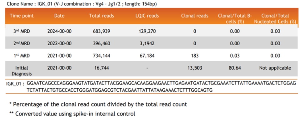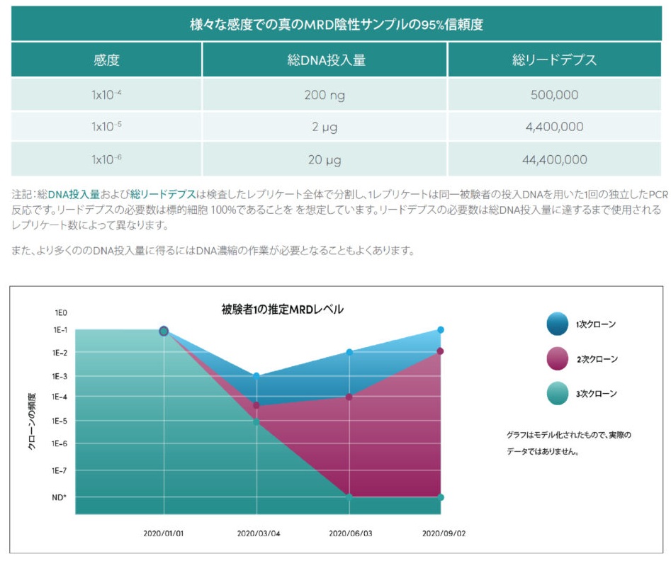 微小残存病変(MRD)は血液腫瘍において強力な予後因子であり、治療の適切な選択や予後の予測において重要な役割を果たします。MRDの測定にはフローサイトメトリーを利用した方法や症例特異的なプライマーを用いた定量PCRを利用した方法がこれまで利用されていましたが、フローサイトメーターを利用した手法では時に主観的な判断になるケースがあり、定量PCRでは症例特異的なプライマーがデザインできないケースもあるため、近年では次世代シークエンサー(NGS)を用いた解析手法も開発されています。NGS解析の想定されるメリットとしては感度が高く、客観性も安定的に高くなり、ハイスループット化も可能なことです。