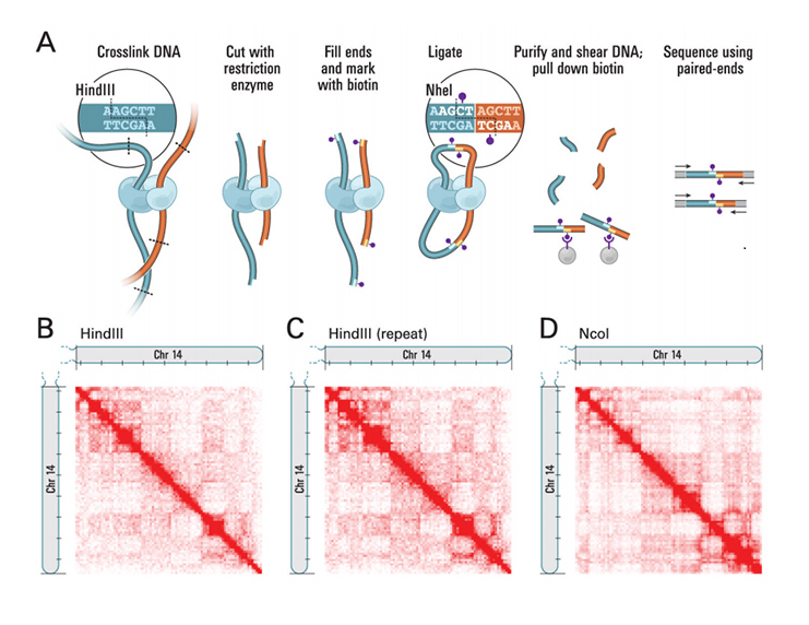 - Hi-C実験では、制限酵素による切断、そして付着末端の修復が行われ、その際にビオチンが付加されます。その後、相互作用を保持したまま、得られた平滑末端を環状化します。続いてDNAはストレプトアビジンビーズでプルダウンされ、その後のライブラリー調製のために精製されます。
