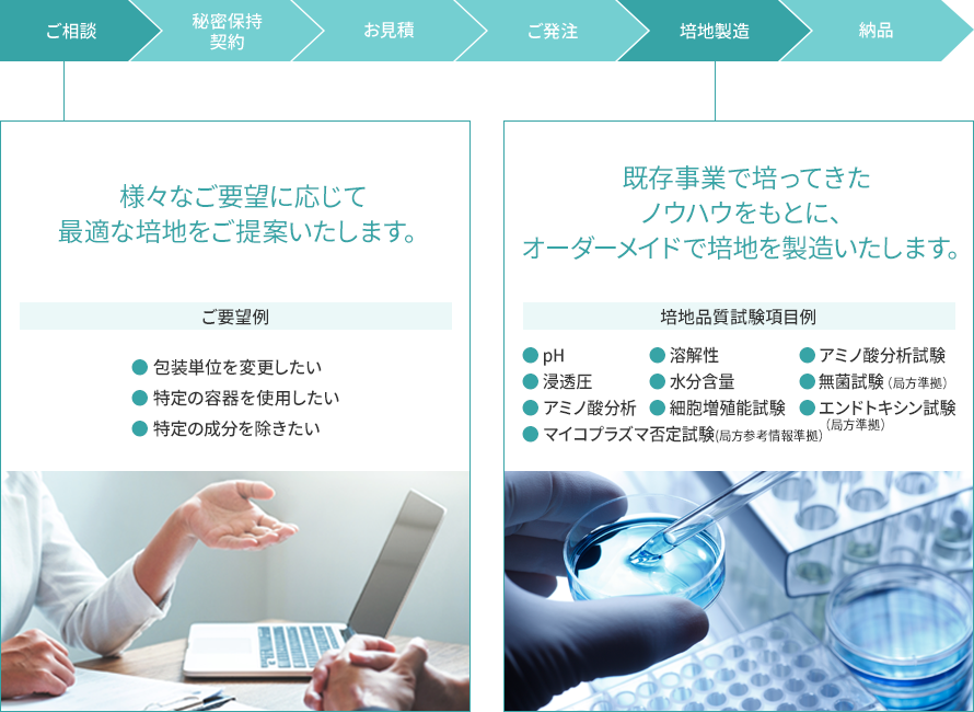 分析結果をもとにお客様の培養する細胞により適した培地のご提案・ご提供が可能です!(カスタム培地製造