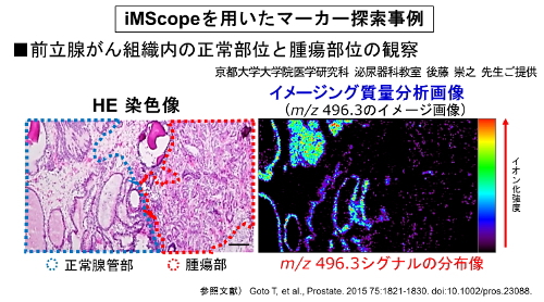 近年MALDI法による質量分析を用いて生体組織切片から直接、対象とする生体分子 (低分子代謝産物,脂質,ペプチドやタンパク質など)を解析する方法が注目を集めており、 疾病部位におけるバイオマーカー探索への応用が期待されています。