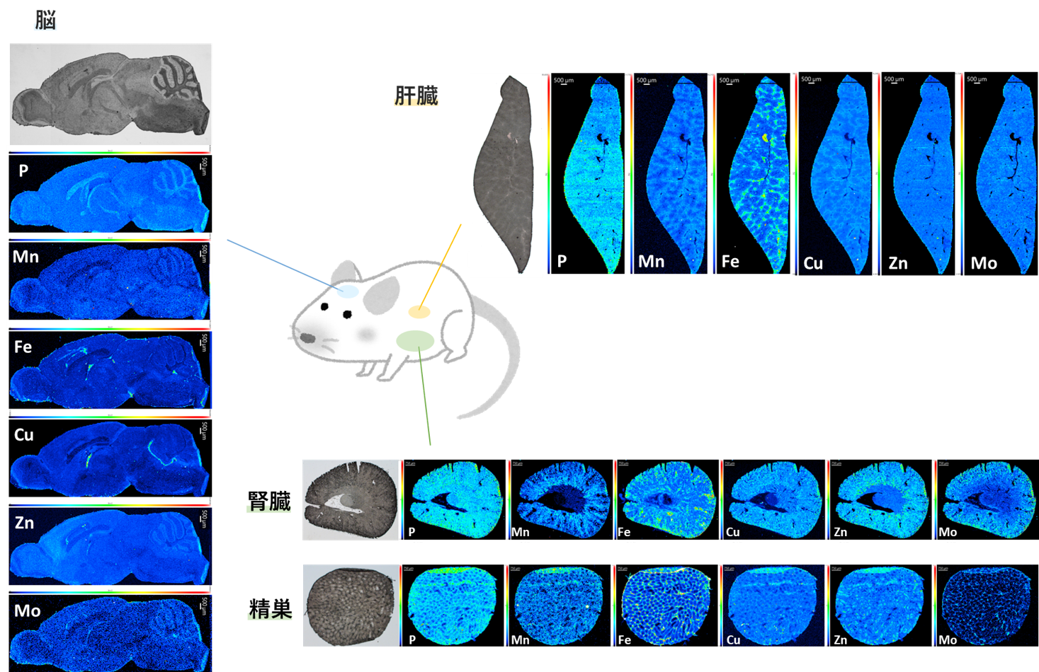 LA-ICP-MSを用いて、マウス組織に含まれる生体必須元素(リン、マンガン、鉄、銅、亜鉛、モリブデン)の分布を可視化しました。(