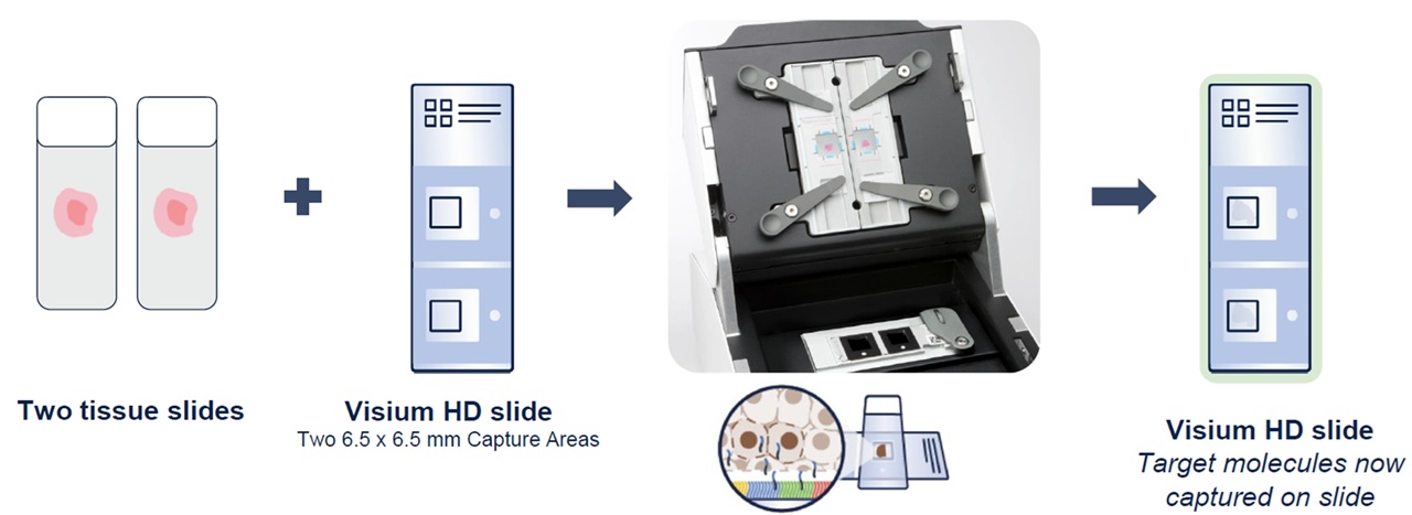Visium HD専用スライドには、6.5 × 6.5mmのキャプチャーエリアが2領域搭載されており、それぞれの領域には約1,100万個の2 × 2µmサイズの正方形グリッドが敷き詰められています。各グリッドには固有のバーコードを持つオリゴヌクレオチドが配置されており、これにより単一細胞レベルに迫る空間分解能での遺伝子発現解析が可能になります。(