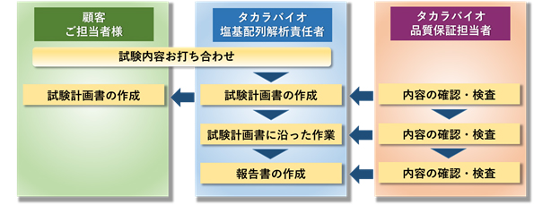 事前の作業内容すりあわせを専門スタッフと行い、試験計画書を作成いたします。 作業は標準操作手順書(SOP)にもとづき熟練した技術者が解析を行い、解析結果には、報告書、生データ等、必要に応じた資料をお返しいたします。 各種書類や作業工程について、品質保証部門の担当者が確認を行い、信頼性を保証いたします。